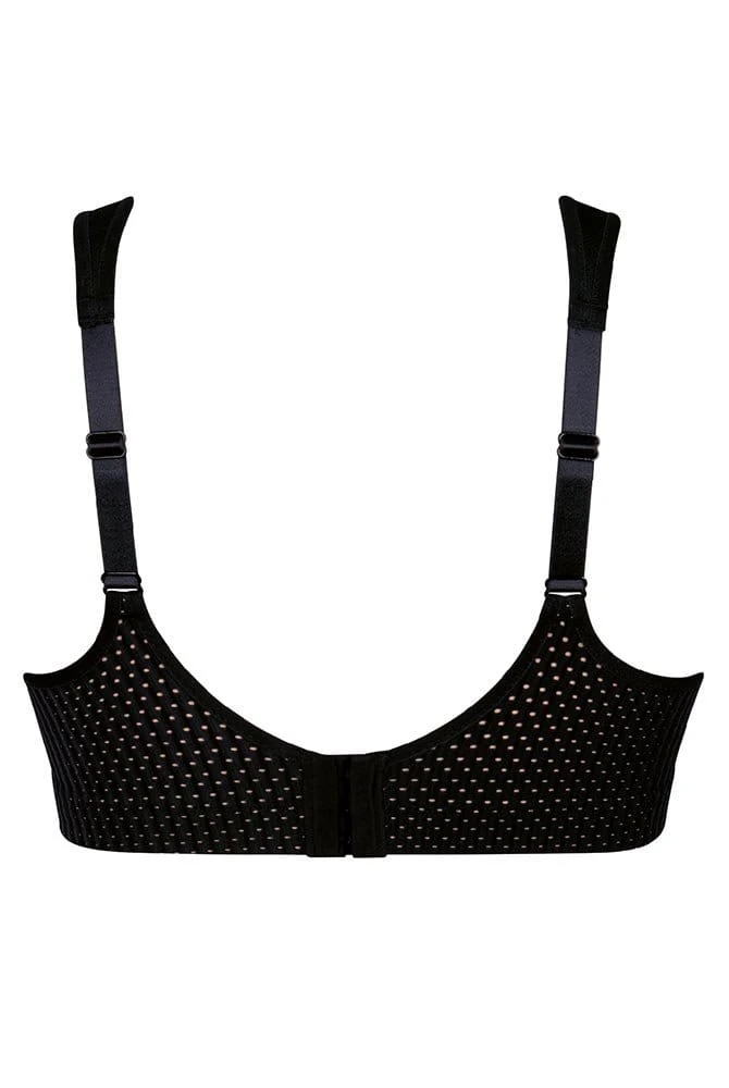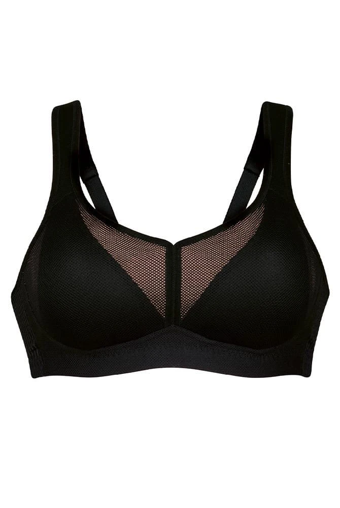 Doppellagige Cups werden ergänzt durch ein ultraleichtes Netz, dass unterfüttert ist. Flache weiche Abschlussbänder sorgen an Dekolleté und Armausschnitt für hohen Tragekomfort. Ergonomisch geschnittene und verstellbare Komfortträger tragen sich weich und verhindern ein Einschneiden. Der atmungsaktive Netzrücken sorgt für einen Temperaturausgleich und Luftdurchlässigkeit.